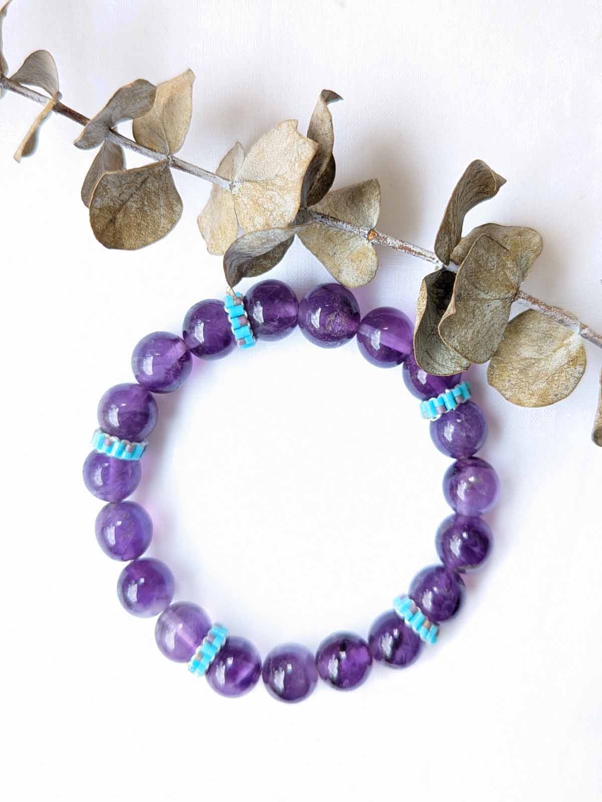 The Amethyst is one the most beautiful stones around. A gorgeous purple these crystals are supposed to improve mental health . Our Amethyst stretch bracelet is also embellished with woven beaded components in complementary colors- such an easy wear and it goes with everything. Wear it single or if you would like to combine it with other crystals then we have a whole lot of them. See more in the bracelets section.