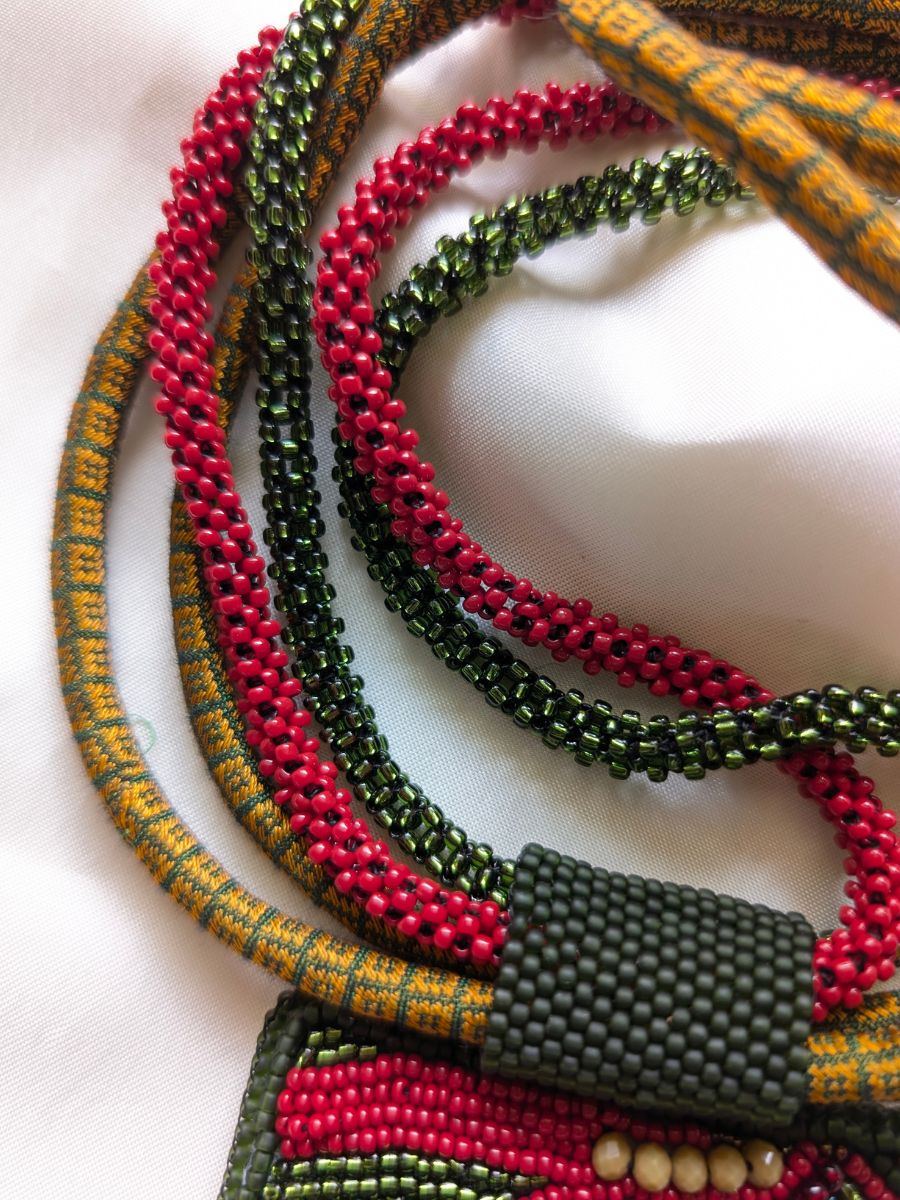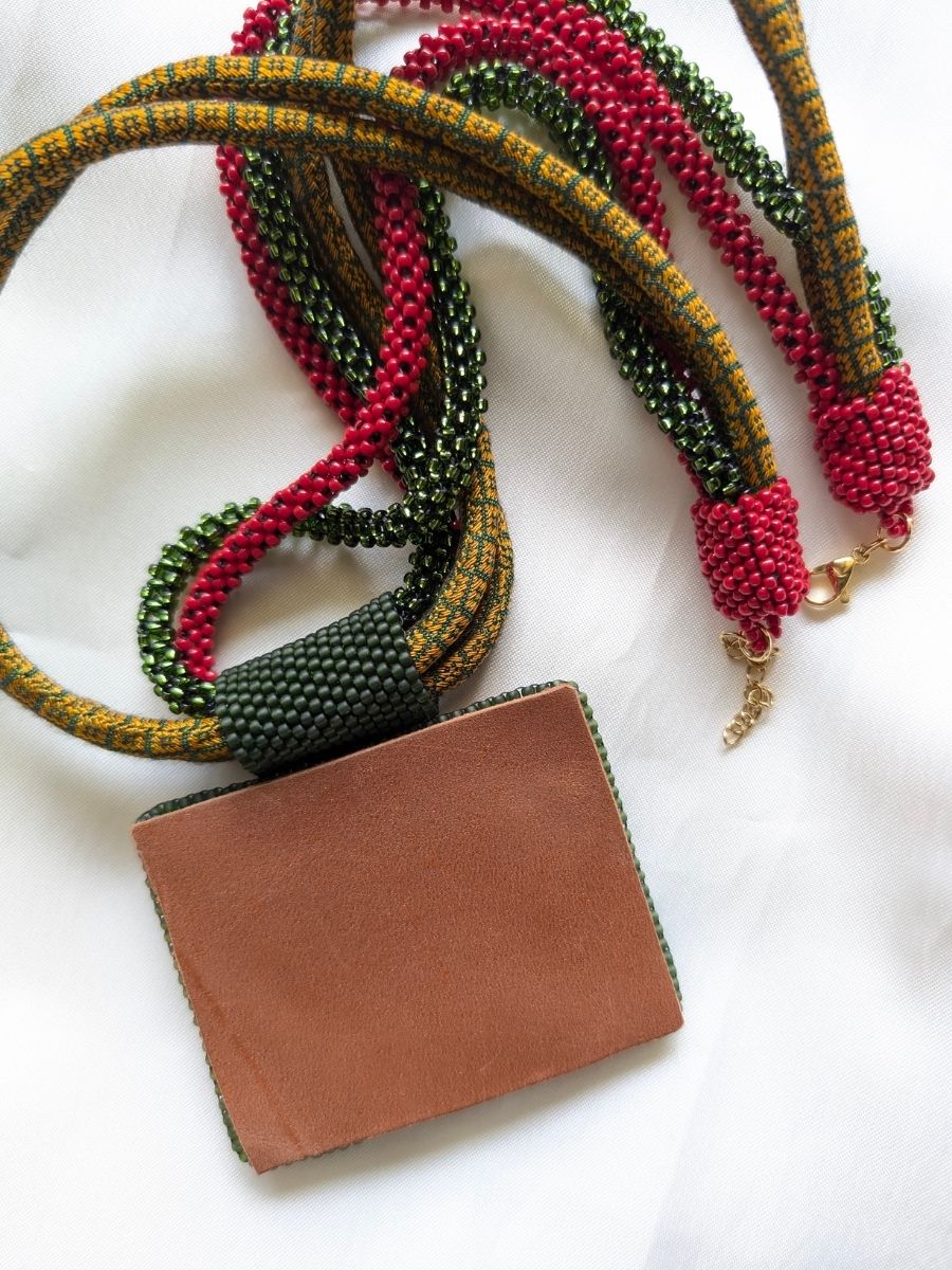 This handcrafted beaded necklace is a wearable work of art. The pendant features a wavy, landscape-inspired design meticulously hand-embroidered using hundreds of tiny glass seed beads in rich jewel tones. At its heart sits a polished red-brown onyx stone—adding an earthy warmth and grounding elegance.