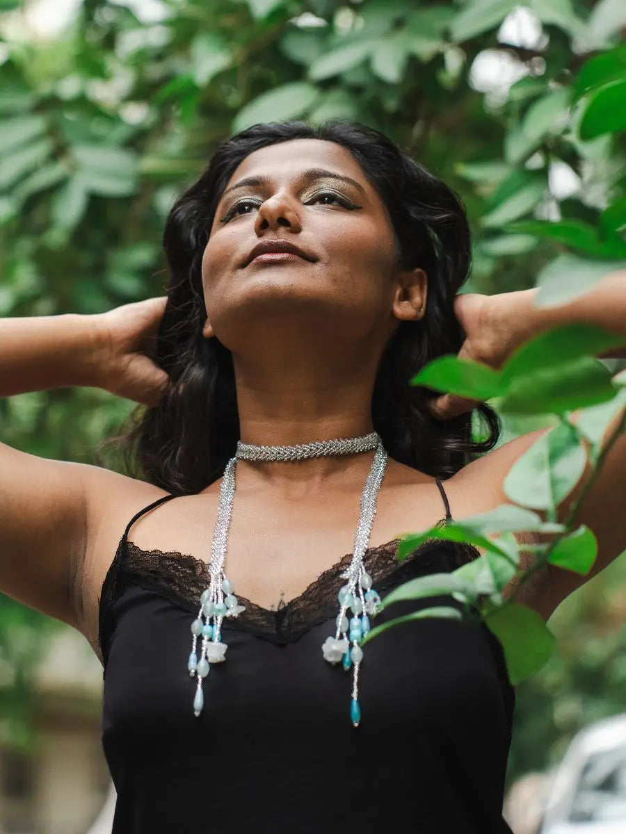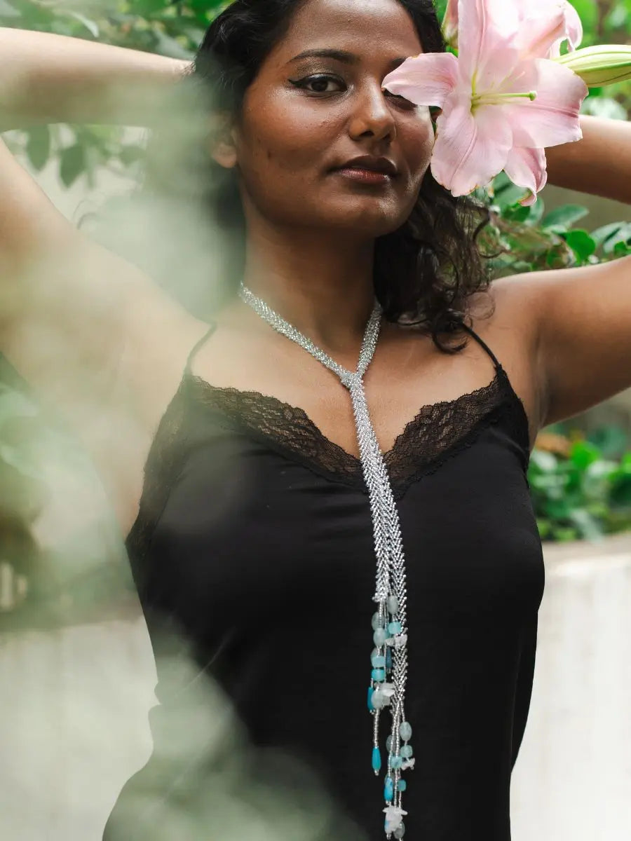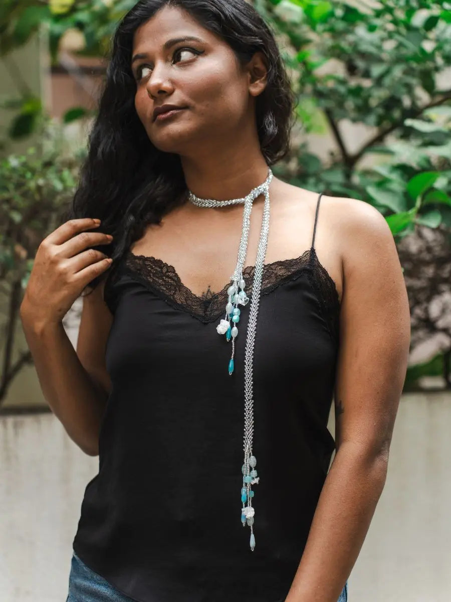 The Nyra Blue Lariat Necklace is a blend of modern edge and artisanal elegance. Handwoven in silver-hued beads, the lariat-style rope gracefully ties at the neckline, letting a cascade of blue and white natural stones—in varied shapes and textures—fall freely with movement and charm.This striking statement necklace for women is lightweight and full of personality, wear it the way you like it - tied low down or near yor neck or just wrapped around your neck, making it a versatile pick for resort wear, elegant evenings, or even as a unique gift for your friends.