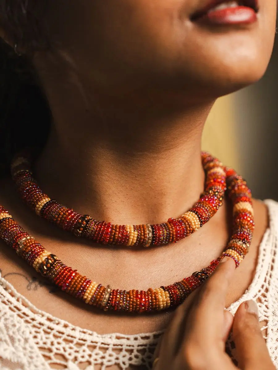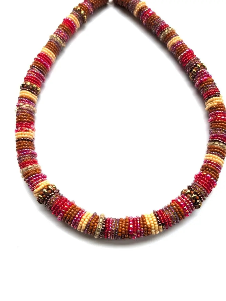 Turn up the heat on your look with the Sharlet Beaded Rope Necklace, a handwoven celebration of bold color and craft. This thick, lightweight rope-style necklace features vibrant red and multicolor beads—each one carefully chosen and intricately woven to create a joyful, standout accessory.