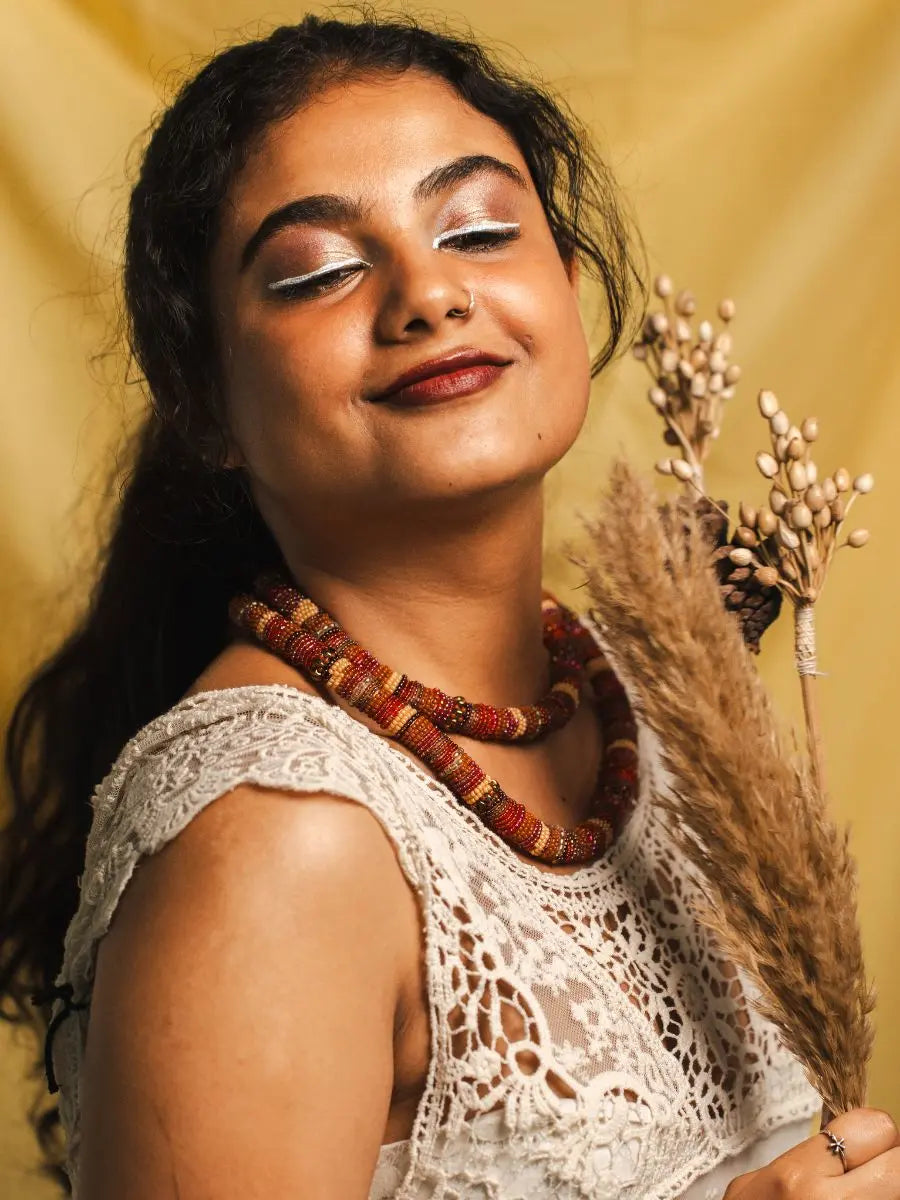 Made using varied bead shapes and festive hues, this necklace is perfect for adding a pop of color to neutral outfits or doubling up for a bold, statement look. Whether you're dressing up for a festive gathering or adding flair to your everyday saree, this piece brings in the warmth of tradition with a modern twist.