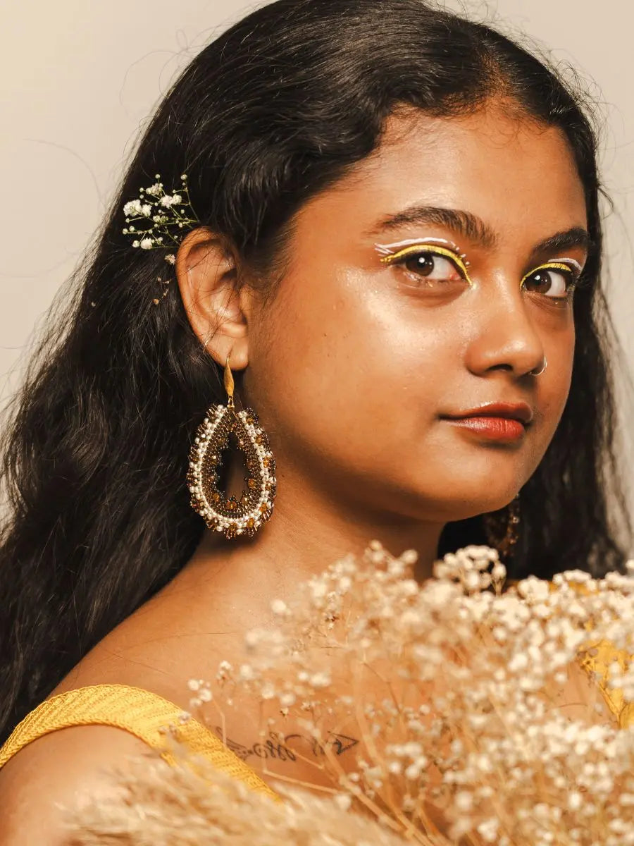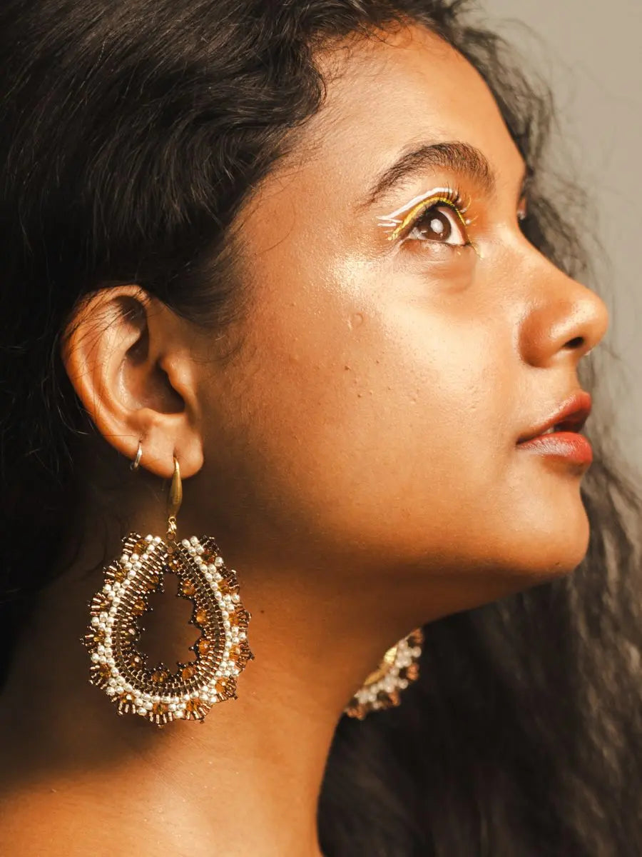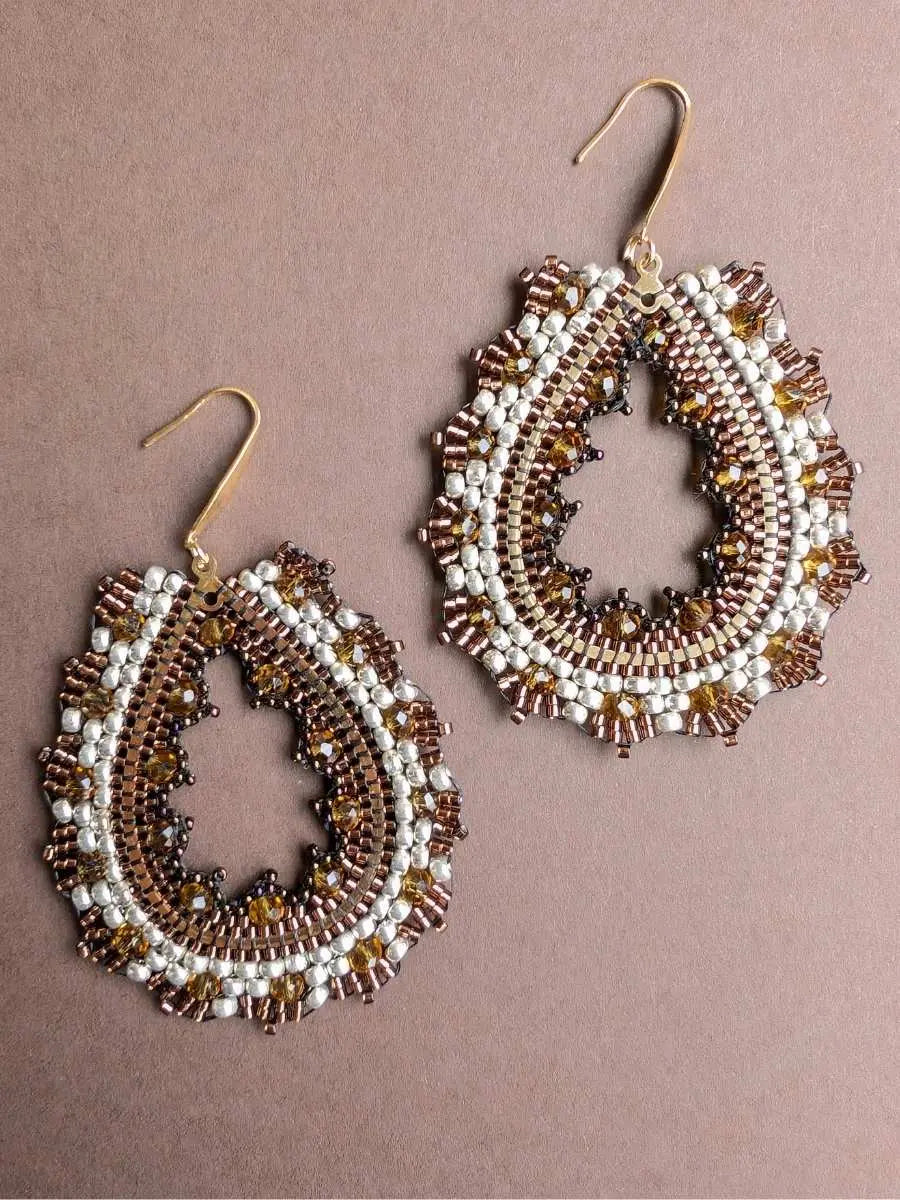 Make a bold yet elegant statement with these handcrafted teardrop beaded earrings—a celebration of traditional artistry and contemporary style. Featuring intricate handwoven beadwork in hues of antique bronze, silver, and shimmering gold, this dual tone gold & silver pair instantly elevates festive and evening looks.