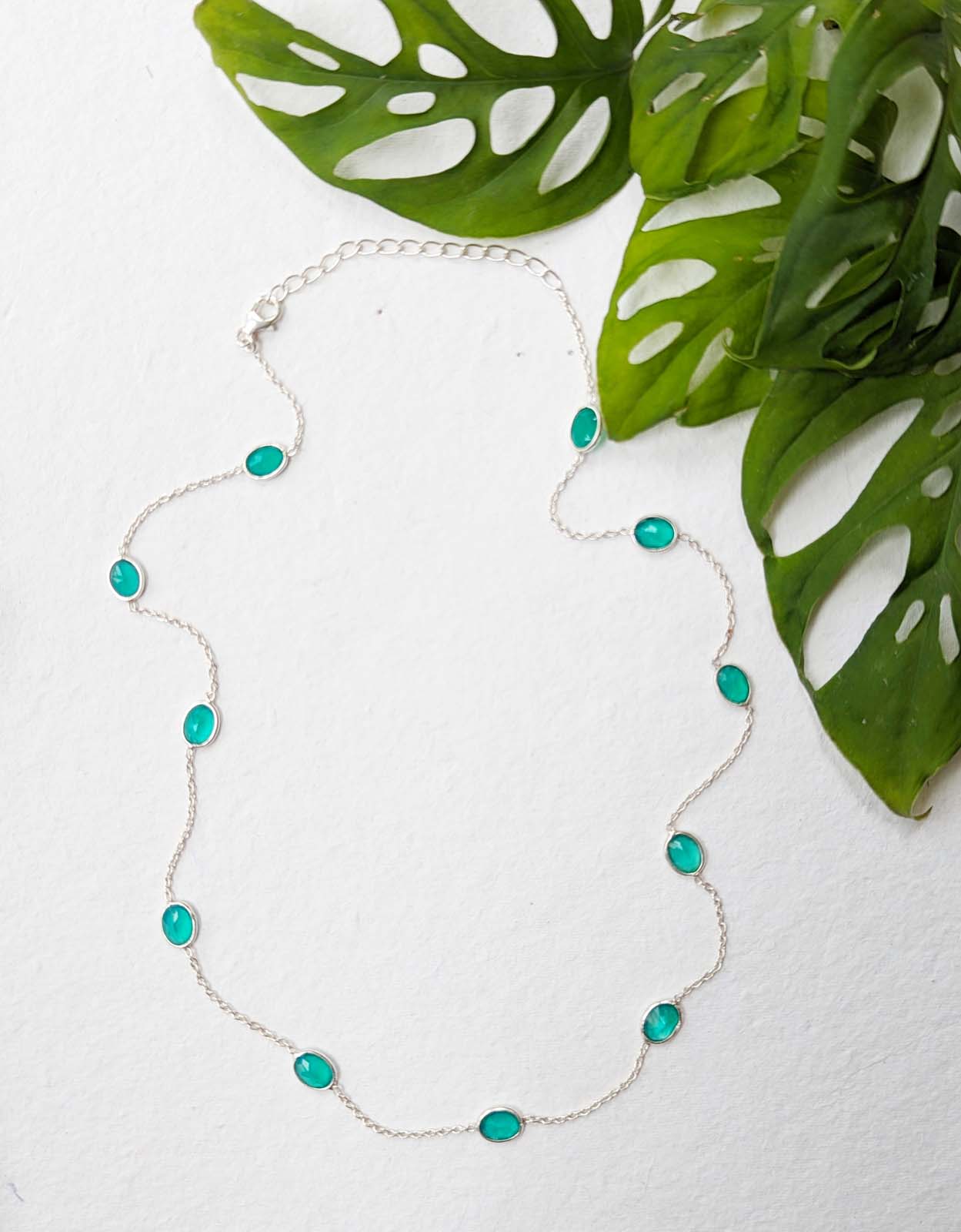 This necklace is a harmonious blend of elegance and nature's beauty. The stunning green onyx gemstone is known for its mesmerizing green hues that evoke feelings of tranquility and renewal. The gemstone's vibrant color is complemented by the sterling silver setting, creating a timeless and versatile piece of jewelry.