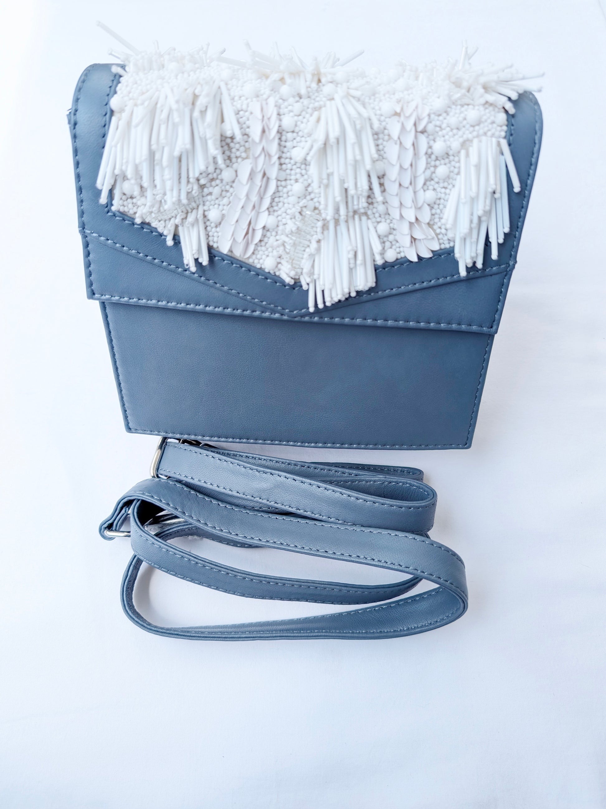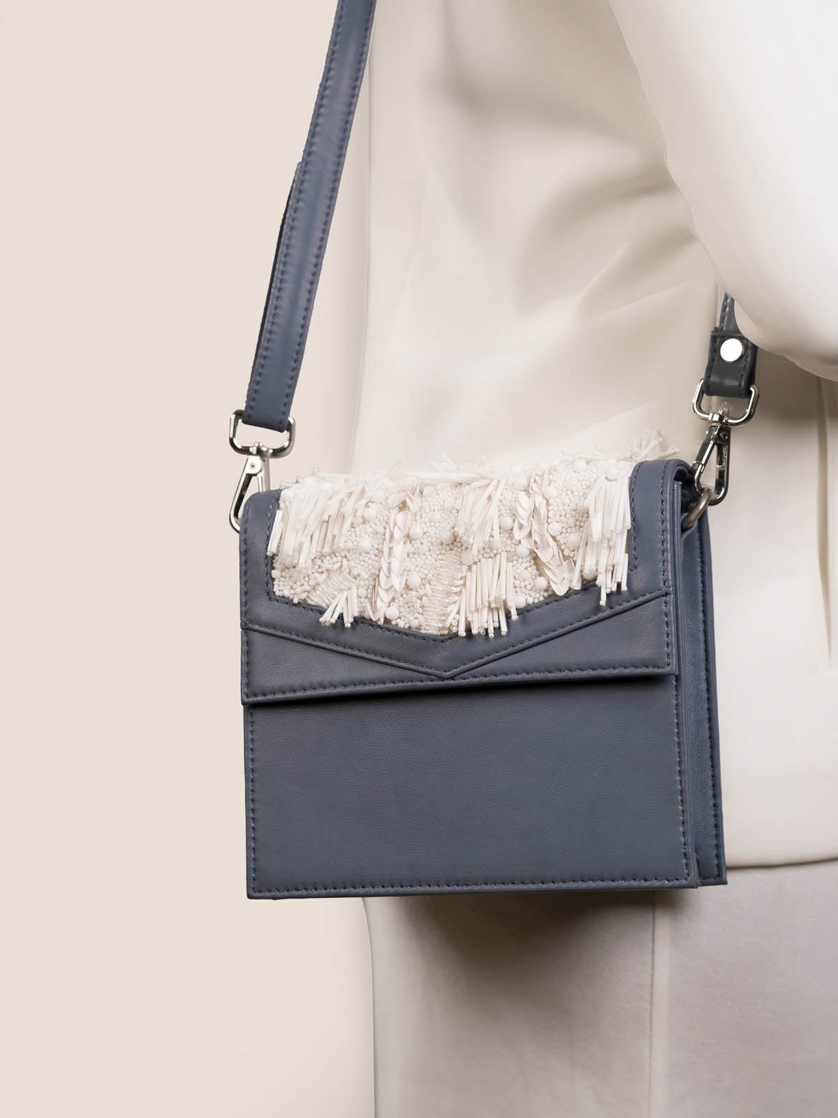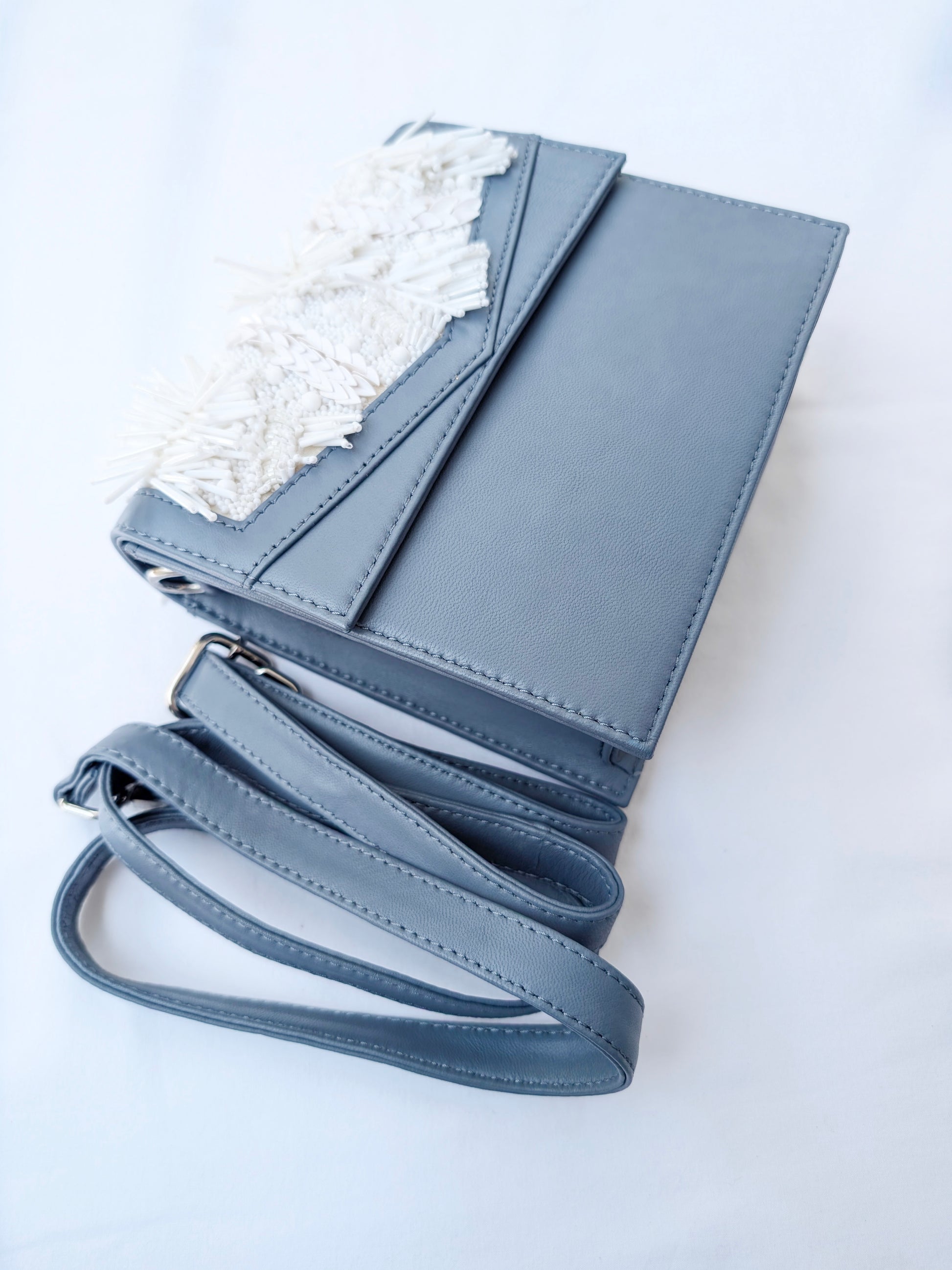 Add a touch of boho-chic elegance to your wardrobe with the Silver Storm Handbag, a standout accessory crafted in sophisticated grey leather. Featuring a striking white beaded fringe embroidery on the flap, this handcrafted statement handbag blends modern luxury with bohemian flair.