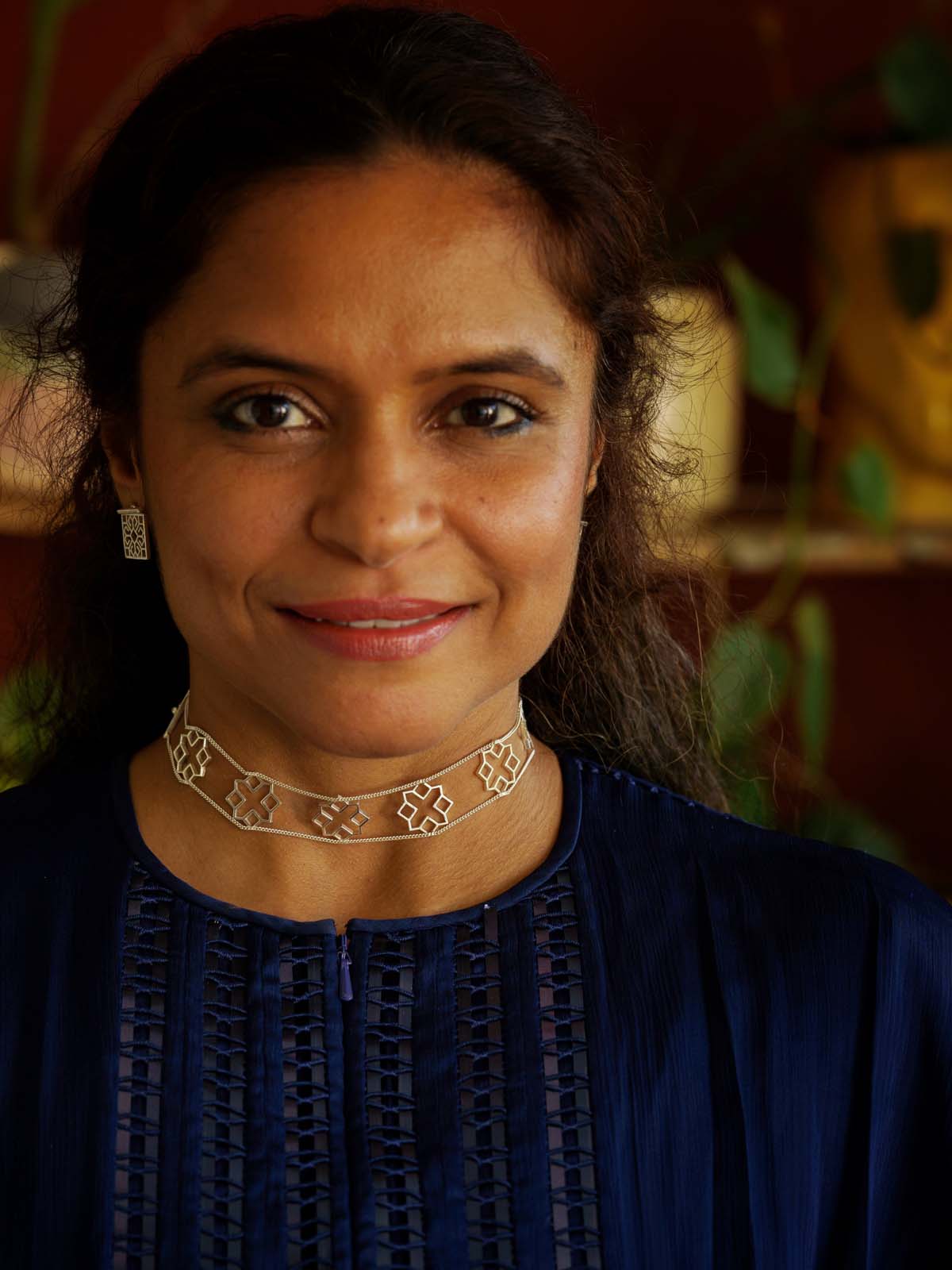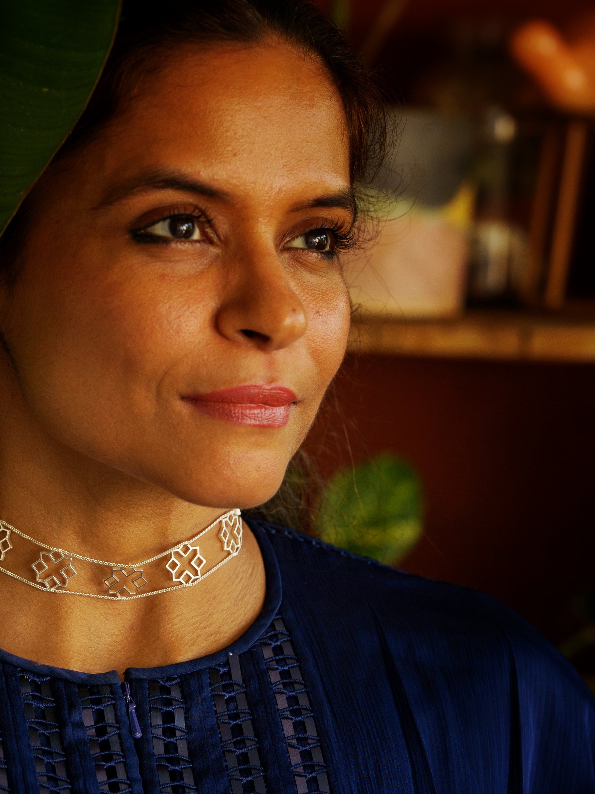 The Sutra Choker Necklace is a refined expression of timeless elegance and artistry. Crafted in pure silver, this striking necklace features a series of square-shaped components, each adorned with intricate Kasuti-inspired motifs, seamlessly joined together to form a graceful choker. The geometric design and delicate patterns evoke a sense of balance and sophistication, making it a versatile piece that complements both traditional and modern ensembles.